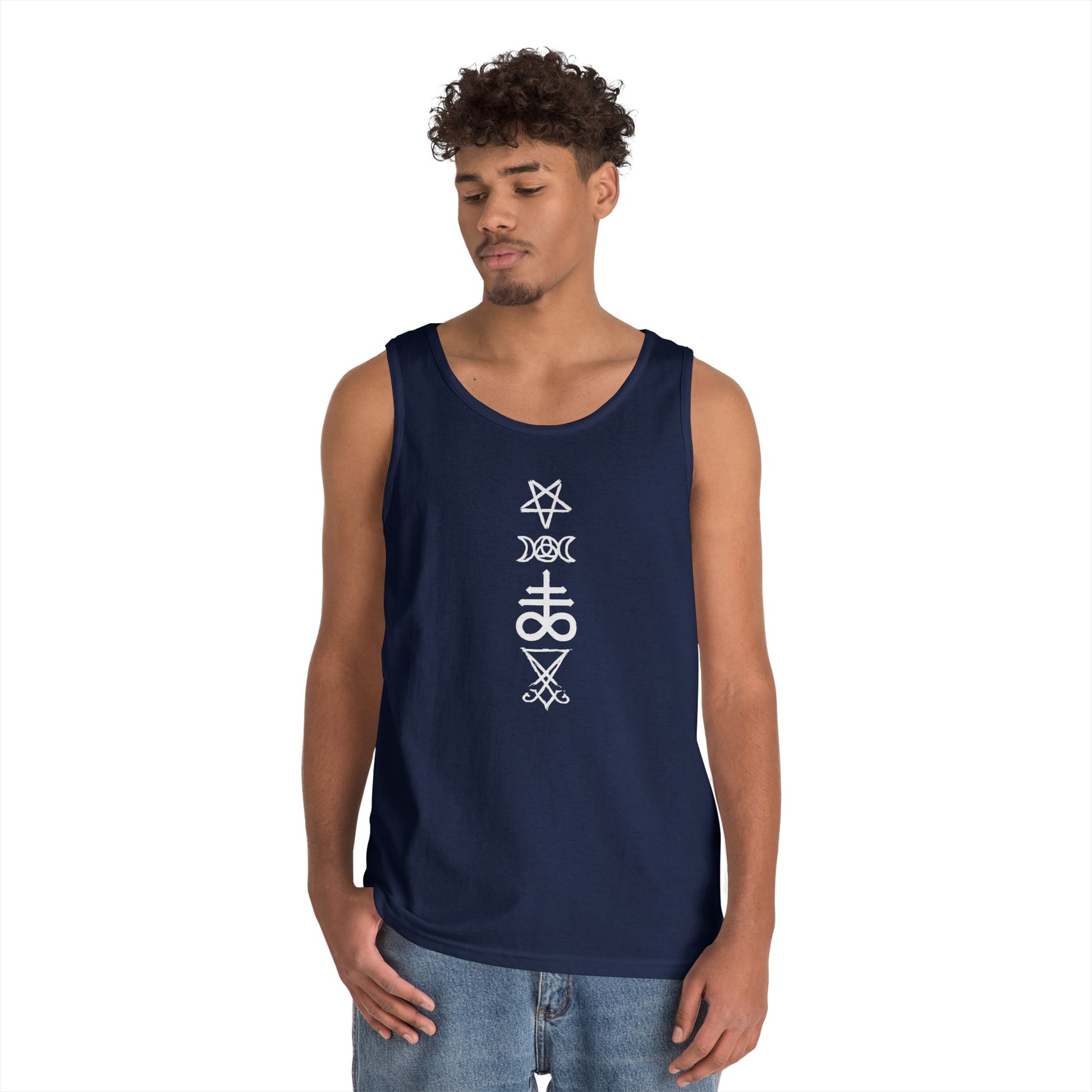 A clean, symbolic tank designed for ritual-minded and occult-leaning wardrobes. Soft, medium-weight cotton falls naturally against the skin while a vertical stack of minimalist esoteric sigils anchors the front with quiet potency. Wear it layered under a robe or alone during warm-weather gatherings; its classic cut and tear-away label keep the focus on movement, breath, and intention. The monochrome palette and balanced spacing let the symbols read like a personal talisman—subtle, wearable, and built to last.